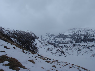 El Petrachema (2.371 m.) és un dels cims destacats del cordal fronterer d'aquest sector, juntament amb els pics d'Acherito (2.095 m.) i sobretot la Mesa de los Tres Reyes (2.448 m.), trifronterer entre els antics regnes de Navarra, Aragó i França. Comencem doncs a caminar des del refugi en direcció est per amplis terrenys de pastura. Caminem per terreny fangós, ja que la neu es comença a desfer. Més amunt la neu és més constant. La pujada és progressiva, de bon fer. La Sílvia va a davant i tiba fort, segurement preveient el mal temps que s'acosta. De fet el cim del Petrachema es veu cada cop més cobert, i els núvols s'acosten.